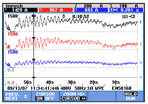 上圖為華天HTEQ系列高速動態(tài)消諧無功補償裝置實時跟蹤補償效果實測數(shù)據(jù)。黑色曲線為快速波動的負(fù)荷電流,紅色曲線為實時跟蹤的補償電流,藍色曲線為補償后網(wǎng)側(cè)電流。HTEQ跟蹤迅速準(zhǔn)確,補償前負(fù)載峰值電流高達1423A,補償后降低為693A,電流波動幅值也由原來的約900A降低至350A左右。